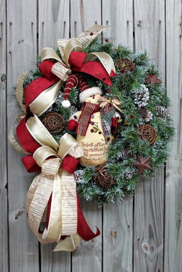Этот венок — снеговик делается очень просто. Смотаем три круга разного диаметра из прутьев, соединяем между собой веревочкой. Из пластикового горшка, разрезав его пополам, получаем шляпу. Приклеиваем ее горячим силиконовым клеем на верхний круг — голову. Привязываем на шею снеговика шарф. И новогодние шары на шнурках — галстук, прикрепляем на шею.