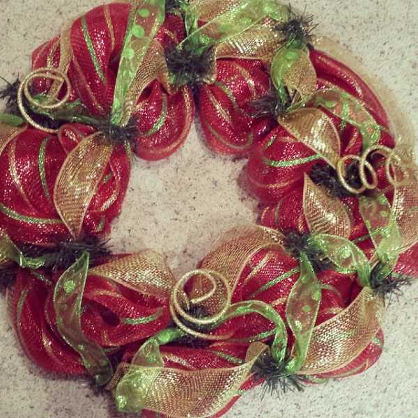 Ленты тематических (карсный, зеленый, золотой, белый) цветов могут стать необычным рождественским венком на дверь: