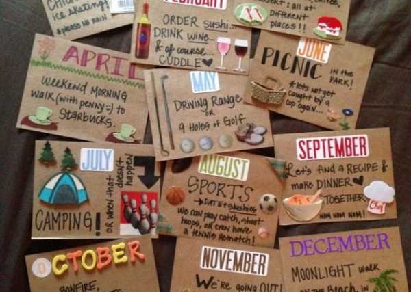 Влюблённые часто мечтают вместе. А что, если запечатлеть это? Вспомните, какие планы вы обсуждали в последнее время? Куда ваша половинка хочет поехать? Чем вы хотели бы заниматься совместно? Сделайте 12 карточек (по числу месяцев до следующего Дня всех влюблённых) и реализуйте ваши мечты в ближайший год. Например: