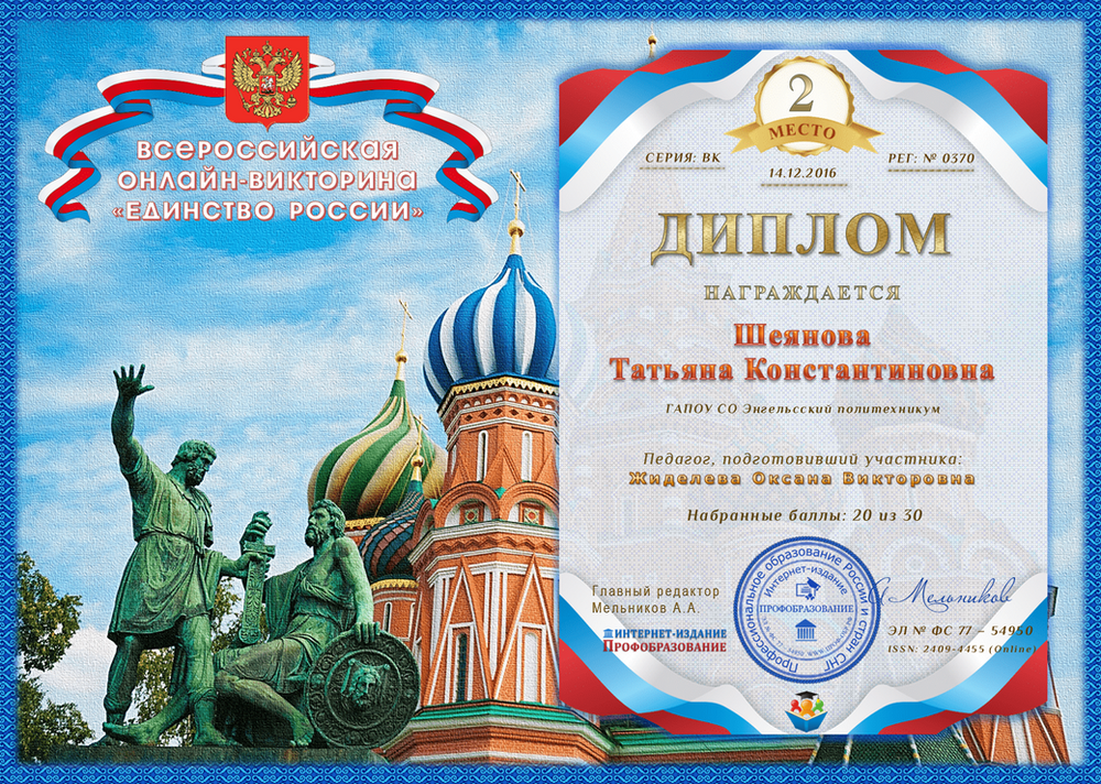 Интеллектуальная викторина к Дню народного единства. Участники, педагоги и родители получают награды сразу после приема заявки.