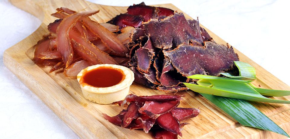 БастурмаБлюда из вяленого мяса есть практически у любого народа. Хорошо прижилась в нашей стране бастурма, которая появилась ещё во времена Османской империи. Для её приготовления берут говяжью вырезку, солят, а затем кладут под пресс, для того чтобы удалить лишнюю влагу из мяса. После этого мясо натирают специями или кладут в ёмкость со смесью из приправ. Классические специи для бастурмы – это чёрный и красный перец, а также чеснок. Кроме того, на Востоке используют голубой пожитник. Затем мясо подвешивают на улице или в специальных шкафах для высушивания. Получившееся блюдо имеет приятный аромат и отличный вкус.