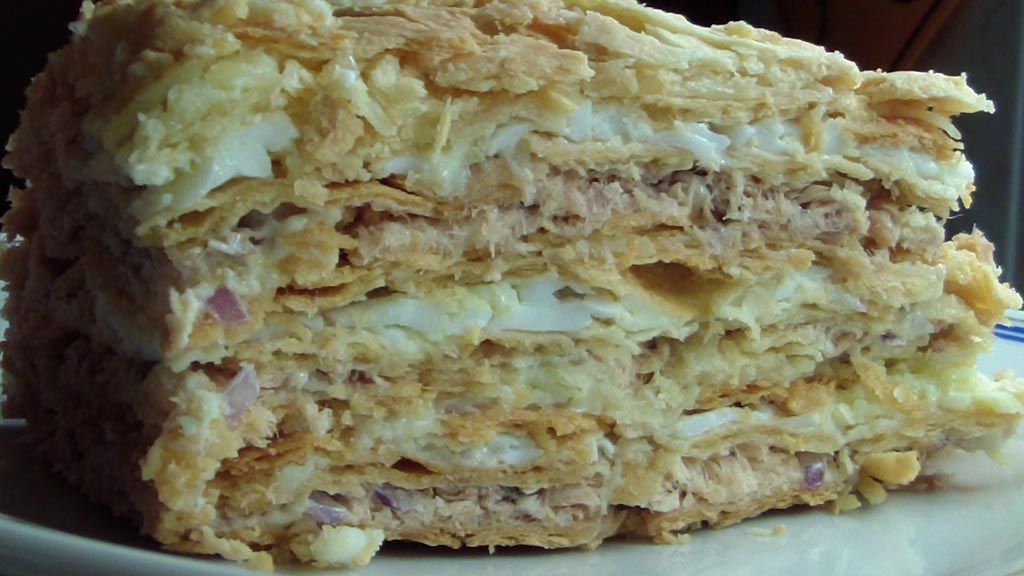 Готовим сытный закусочный торт Наполеон для праздничного стола. Основным компонентом торта являются рыбные сардины, именно они задают основный вкус блюду. Рыбная начинка отменно сочетается с морковью, яйцами и сливочным сыром. К моркови для пикантности добавляем немного чеснока. Коржи торта готовим из слоеного теста. Во время настаивания они хорошо пропитываются начинкой и становятся мягкими. Торт-салат получается в меру влажным, легко нарезается на порционные кусочки.