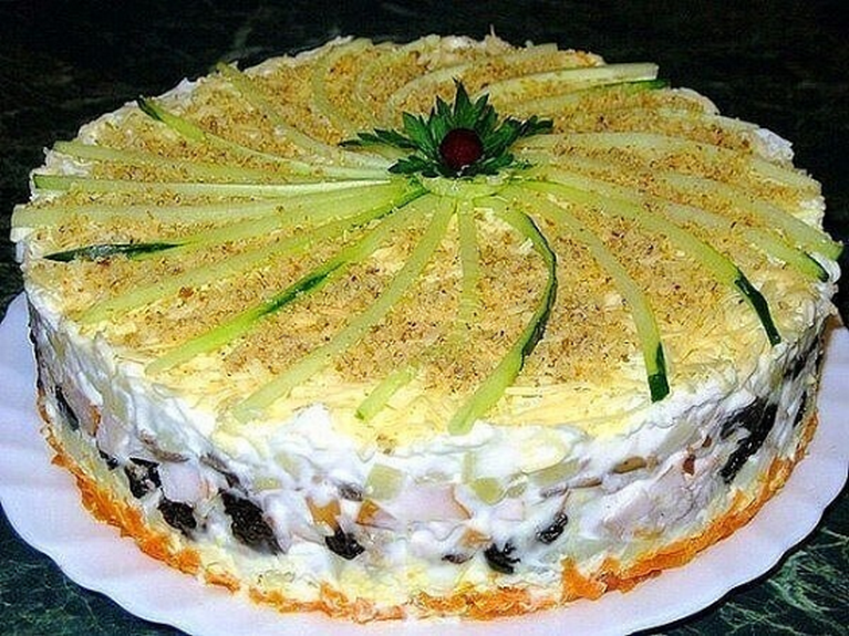 Зеленый лук мелко нарежьте, украсьте им верхушку салата, выложив полосками. На лук уложите зерна граната.Торт нарежьте на порционные кусочки, подайте на стол. Приятного аппетита!