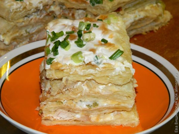 Рецепт Закусочный слоеный тортик со сливочно-творожным кремом и куриной начинкой