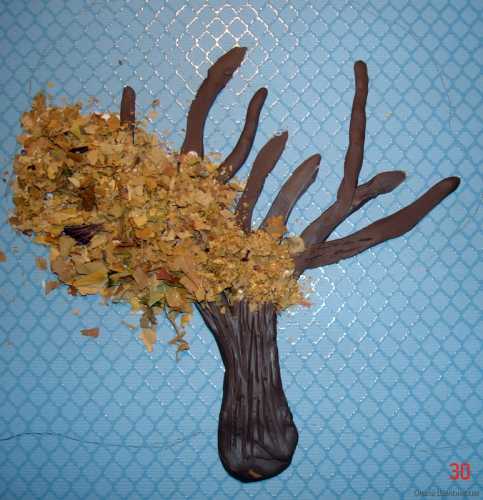 Всю работу сушим на горизонтальной поверхности в течение нескольких часов. После высыхания стряхиваем остатки листьев, перевернув картинку изображением вниз. Можно слегка потрясти аппликацию, лишние листочки облетят, и дерево будет выглядеть очень натурально.