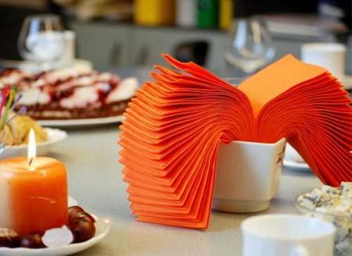 Данный вариант подойдет для семейного ужина или компании близких друзей. Как красиво сложить бумажные салфетки в стакан, отлично видно на фотографии ниже. Выберите большую чашку или пиалу с высокими краями. Салфетки желательно купить плотные и качественные. На поверхности стола разверните одну половину сложенных при покупке вчетверо изделий.