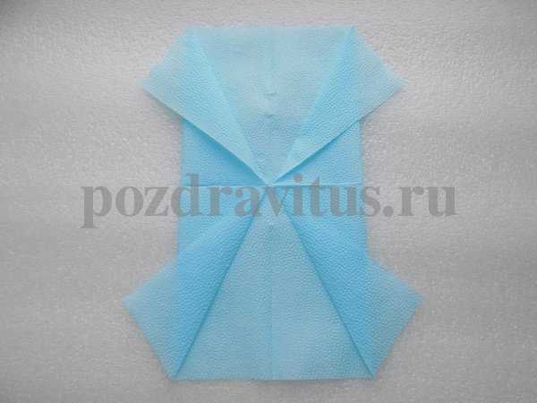 Выполнять действия необходимо соответственно номерам на схеме. Квадраты ткани берите большие, так как сгибов придется делать много. Эффектно будут смотреться такие фигурки на детском празднике, можно даже сервировать стол поделками разных цветов.