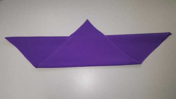 Ткань или бумагу разложите треугольником так, чтобы сгиб находился снизу. Потом углы соедините вместе по центральной вертикальной линии. Получается ромб, нижний угол которого нужно поднять вверх, но не до конца, а, не доходя пару сантиментов до вершины.