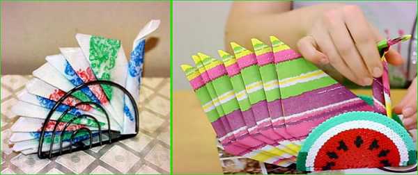 Такой способ отлично подойдет для детского праздника, особенно, если использовать разноцветные, яркие салфетки: