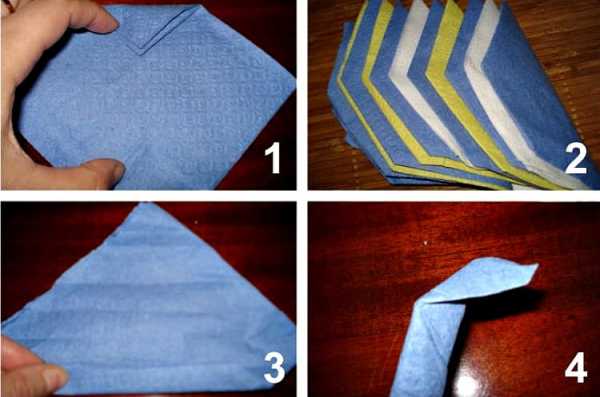 По краю эта фигура загибается под углом, чтобы получилось что-то вроде головы. Если есть желание, можно сделать клюв острее и приклеить глаза. Но тогда салфетка будет выполнять лишь функцию декора. Опять же, можно использовать разных цветов бумажные платочки.
