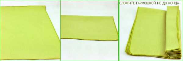 Такую поделку сооружают из больших квадратов. Желательный размер – 40 х 40 см или 50 х 50 см. Каждый кусок ткани необходимо слегка накрахмалить и выгладить. Потом, не выключая утюг, складывайте материю «гармошкой» и тут же каждую складку тщательно проглаживайте горячим утюгом. Перед тем как красиво сложить салфетки в стакан, «гармошку» нужно согнуть пополам и зафиксировать нижнюю часть резинкой или ленточкой.