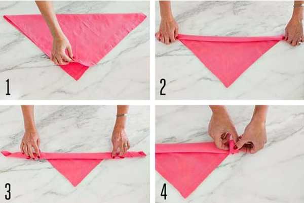 Освободите ровную поверхность стола и поместите перед собой квадрат ткани. Сложите противоположные углы один на другой, чтобы получился прямоугольный треугольник. Затем, начиная с прямого угла, скручивайте ткань «колбаской», но не слишком тугой.