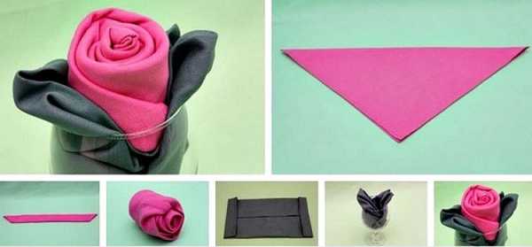 На схеме ниже покадрово изображено, как красиво сложить салфетки в стакан. Изделия для работы выбирайте мягкие, ненакрахмаленные, так как поделку придется сворачивать витками. Цвет должен соответствовать натуральным краскам роз в природе. Красиво будут смотреться красные или лавандовые завитушки.