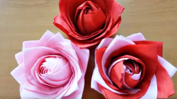 При желании можно создать на столе красивую клумбу с розами. Для этого возьмите неглубокую широкую чашку и пачку бумажных салфеток. Расправьте их в прямоугольники, скрутите в небольшие рулончики и умеренно плотно сложите их в чашку, располагая вертикально. В итоге композиция должна быть похожа на клумбу или вазу с розами.
