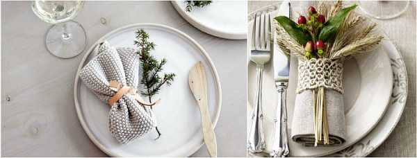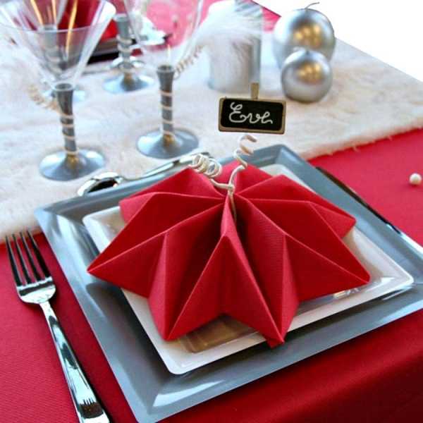 Кстати, необязательно использовать зеленую салфетку для создания «листиков». Прекрасно смотрится сервировка в сочетания серого с красным или белого с розовым.