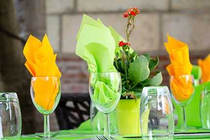Не сложно, но требует некоторого времени, поэтому лучше сложить салфетки «тюльпаном» заранее. Для этого способа лучше подойдут цветные однотонные салфетки, например, красные или желтые, но и белые тоже будут смотреться неплохо. Квадратную салфетку сложите пополам, заверните к середине углы. Переверните салфетку на другую сторону и повторите операцию – заверните углы к середине, на этот раз они у вас получатся длинными. Теперь сложите образовавшийся в основании острый угол пополам, скрутите стороны кругом и вложите в фужер.