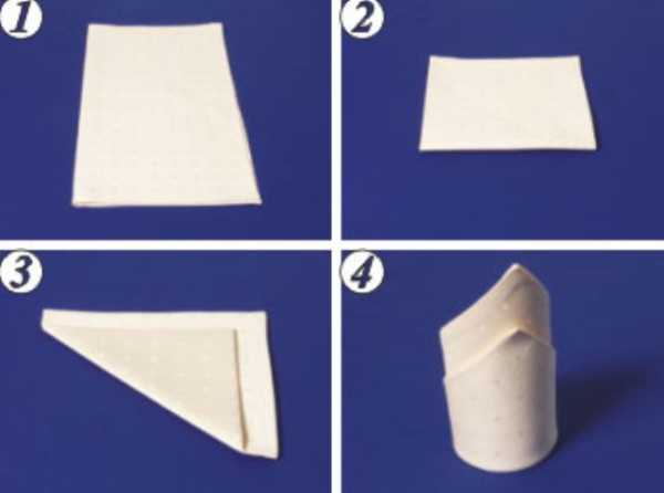 - Рожок. Данный способ декорирования очень прост в осуществлении. Салфетку квадратной формы сложить в 4 раза. Боковые углы загнуть к центру, нижний край подвернуть, чтобы он немного перекрывал боковые. Свернуть изделие вовнутрь таким образом, чтобы края сошлись, а нижний угол получился в середине.