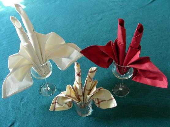 Существует множество способов красиво сложить салфетки. Одними из самых легких, но не уступающих по изяществу, можно назвать такие варианты, в которых салфетка помещается в бокал или фужер. Во-первых, это выглядит всегда аккуратно, во-вторых, не занимает лишнего места на столе, ну и, наконец, держит салфетку, не позволяя ей «рассыпаться». Мы расскажем о трех таких способах, сопровождая каждый из них пошаговыми фотографиями.