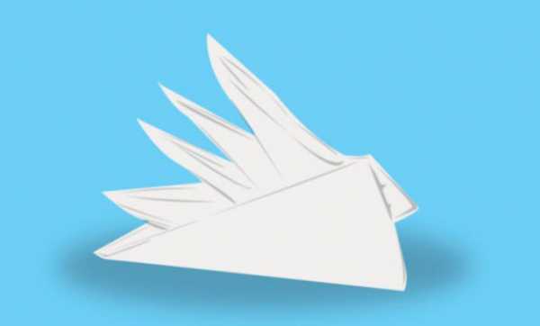 Сначала салфетка разворачивается и складывается в виде книги. После заготовку перегибают пополам вправо. Все четыре бумажных слоя необходимо сложить вдоль. Наметив линию в середине, нужно опустить углы получившегося треугольника вниз, после чего их разворачивают вверх «горой». Затем требуется сложить салфетку надвое. Четыре «гребешка» отдельно вытаскиваются. Конструкция ставится вертикально на салфетницу.