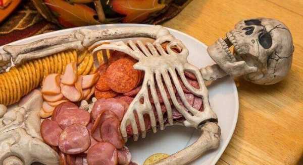 - Мясная и сырная нарезка в пластмассовом скелете человека удивит своей оригинальной подачей абсолютно всех приглашенных. Если скелет раздобыть не удастся, используйте для этой цели старые большие куклы. Просто вырежьте ножом часть живота игрушки, в которой и поместите угощения.