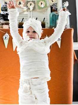 Мумия. Соорудить мумию из подручных средств не составит особого труда. Вам понадобится много бинтов, белая простыня и старое покрывало. Сложите покрывало в форме тела, размер выбирайте сами. Затем окутайте бутафорную мумию белой простыней и густо перевяжите бинтами. Нарисуйте на голове черные глаза. Вместо бинтов можно использовать полосы белой ткани. Готовую мумию можно положить на пол, на стол или поставить у стены.