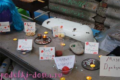 Человеческие органы. По всему помещению ужасов разложите, где только можно части тела, разумеется, ненастоящие. Резиновые медицинские перчатки, наполненные ватой и выпачканные «кровавой» краской похожи на отрубленные кисти. Небольшой (около 1,5 м) отрез канатной веревки, местами покрытый красной краской и подвешенной над ржавым тазиком с «кровью», очень даже напоминает кишечник. Голова куклы с разрисованным лицом и кукольные конечности, прибитые гвоздями к деревянной дощечке, навеивают еще какой ужас. Имитируя глазные яблоки, нарисуйте на белых шарах для пинг-понга роговицу со зрачком. Насыпьте эти муляжи в прозрачную емкость и поставьте на видное место.