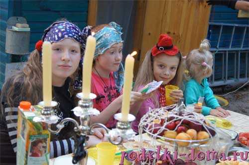 Следующий этап праздника – это застолье. Угощаясь, гости могут поучаствовать в весёлых конкурсах: «кто громче всех закричит», «кто скорчит самую страшную гримасу», «кто жалобней всех заплачет» и т.п. В качестве призов (или просто так) родители могут раздать детям червячков из мармелада.
