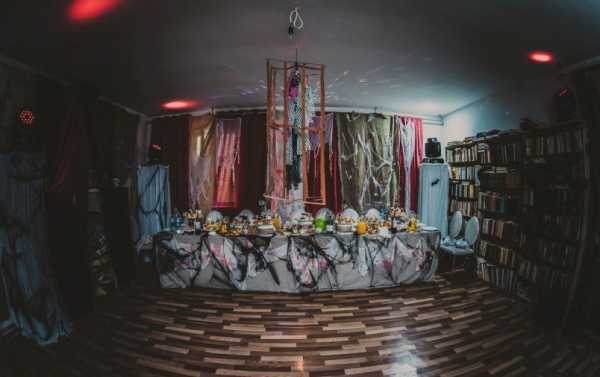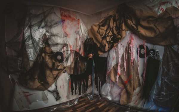 Фон для декораций. Если выбранное место проведения оказалось очень милым и светлым, не паникуйте. Приобретите полотна самой дешевой ткани в темных тонах, задекорируйте ими стены, повесьте вместо гардин, накройте мебель. Для этой же цели используйте и прозрачную плотную клеенку. Сверху сможете прикрепить любые элементы декора, разрисовать мистическими знаками, не переживая за сохранность предметов интерьера.