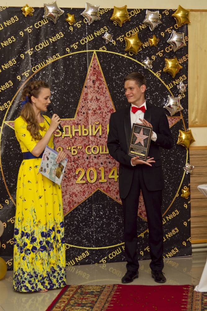 Выпускники по одному проходят по красной дорожке со звездой — резинкой на руке, их объявляют и дают краткую характеристику. Дети замирают в позе для фотографии, встают в 2 колонны.