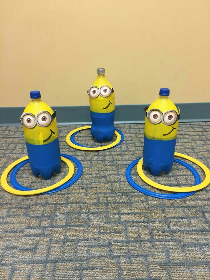 Раскрасьте аэрозолем десять пустых бутылок из-под газировки в синий и желтый цвета, чтобы они выглядели как миньоны. Расставьте бутылки в виде кеглей для боулинга и дайте гостям небольшой мяч. Дайте каждому гостю две попытки сбить как можно больше кеглей.