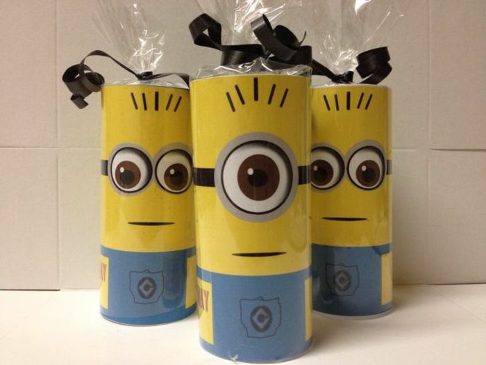 Оберните пустые втулки от туалетной бумаги желтой и синей бумагой, чтобы получились миньоны. Наполните рулеты конфетами или другими маленькими подарками, которые подойдут.